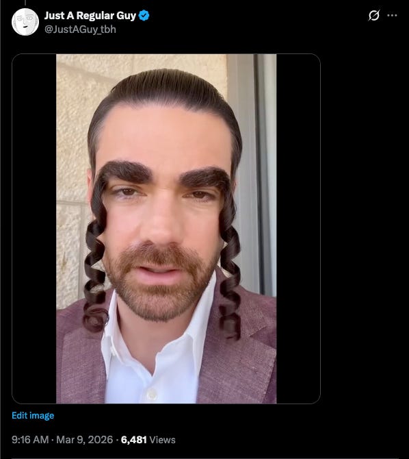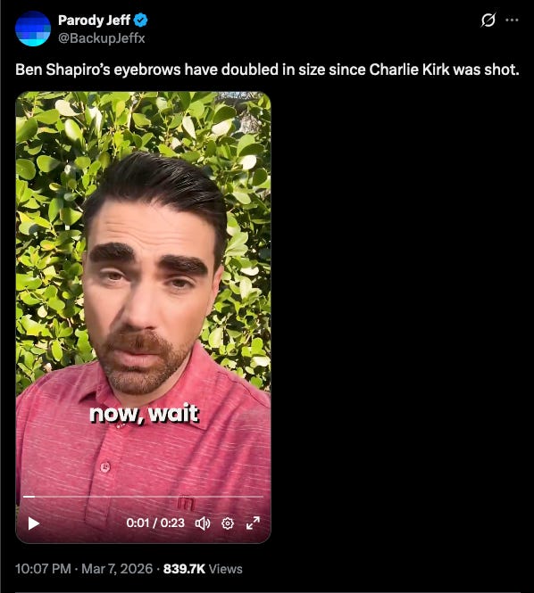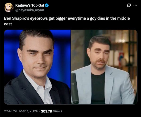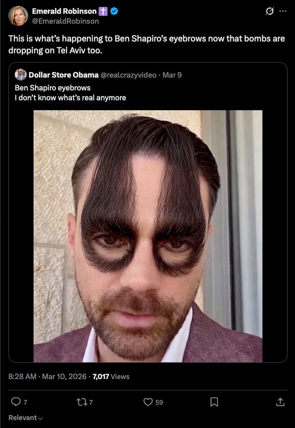 I’m told that what could happen to Ben Shapiro’s eyebrows in the next phase of the war while Iranian bombs are dropping on Tel Aviv could best be described as reckless entanglement in which the eyebrows also grow around the eyes completely and then a kind of blindness can occur in which even bombing a school full of little girls cannot be seen.