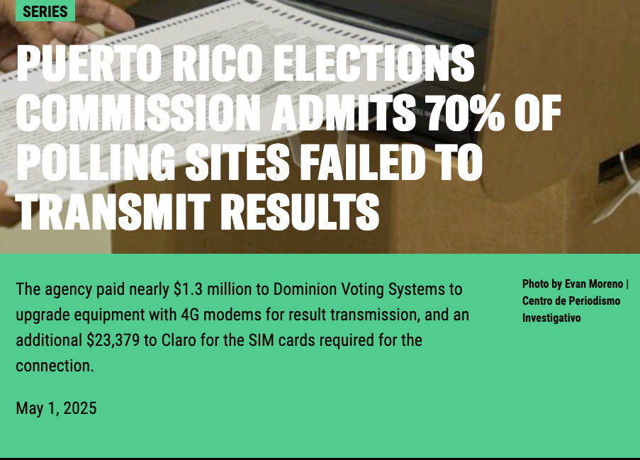 “Of the 4,490 polling stations used in the last elections, 3,119 — equivalent to 70% — were unable to transmit results from their respective voting centers, according to the State Elections Commission (CEE) in response to a lawsuit filed by the Centro de Periodismo Investigativo (CPI) under Puerto Rico’s access to information law.”