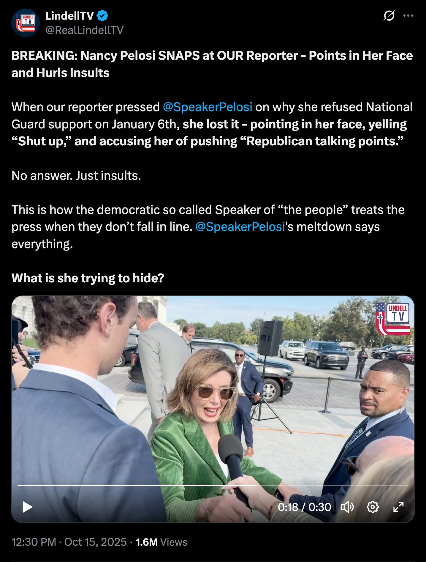 LindellTV’s Alison Steinberg just confronted Rep. Nancy Pelosi (D-CA) about her role in refusing the assistance of the National Guard on Jan. 6, 2021.