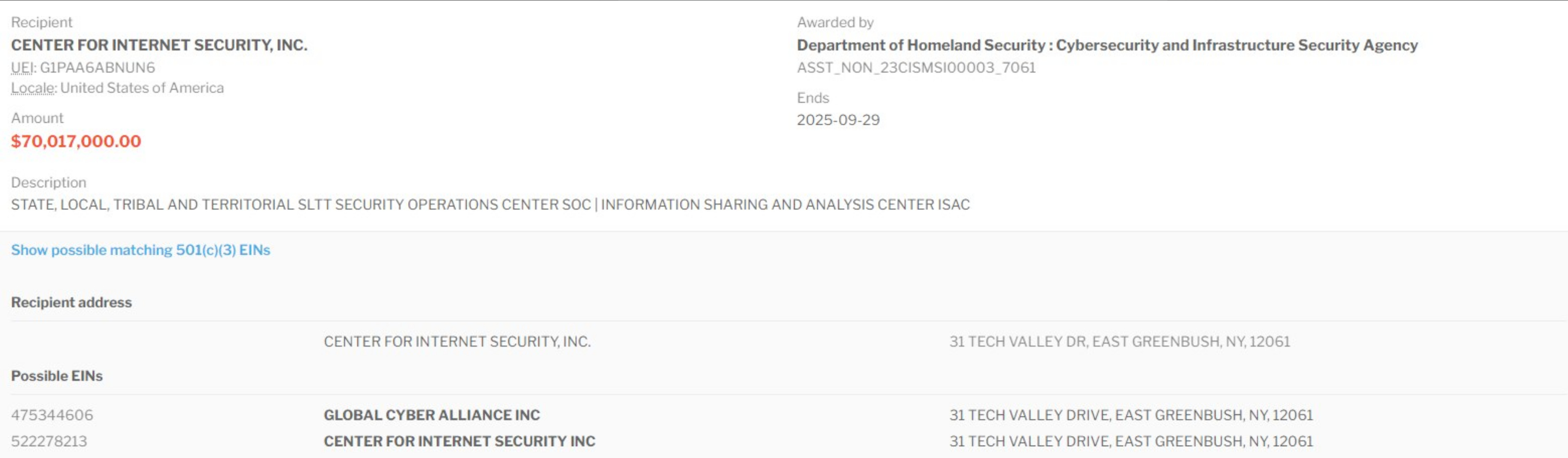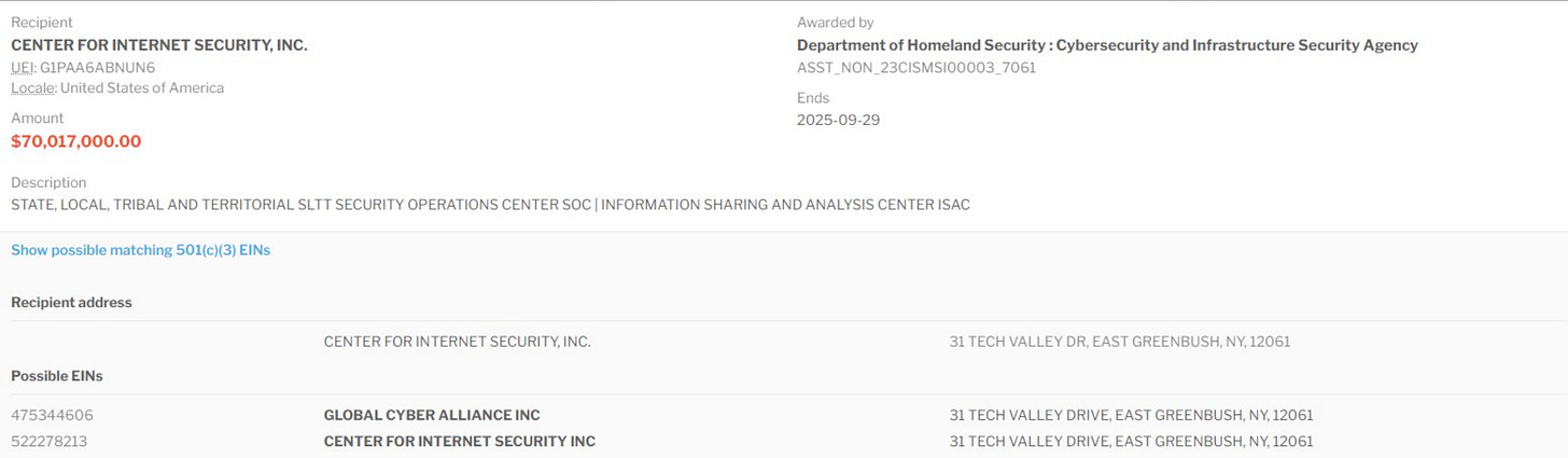 In fact, CIS received $70 million dollars in grants from the Department of Homeland Security’s sub-department CISA — which is actually much more infamous.