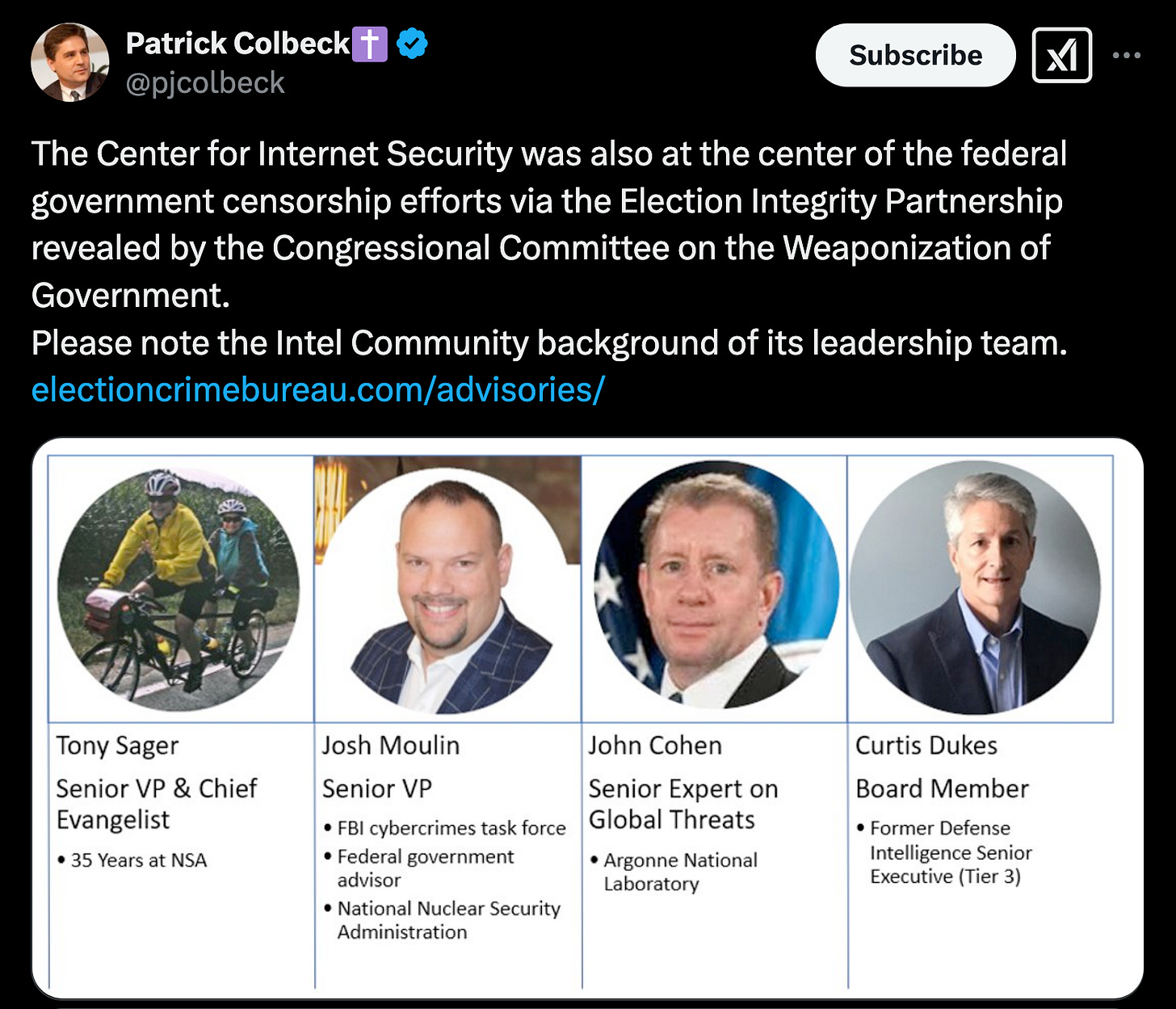 The Center for Internet Security (CIS) is an infamous cog in America’s corrupt election system. It was also at the very center of the illegal Biden regime’s censorship efforts against American citizens. CIS was the bogus “nonprofit” that the Biden regime used to channel reports of “misinformation” and “disinformation” from its government officials to social media platforms like Facebook and Twitter.