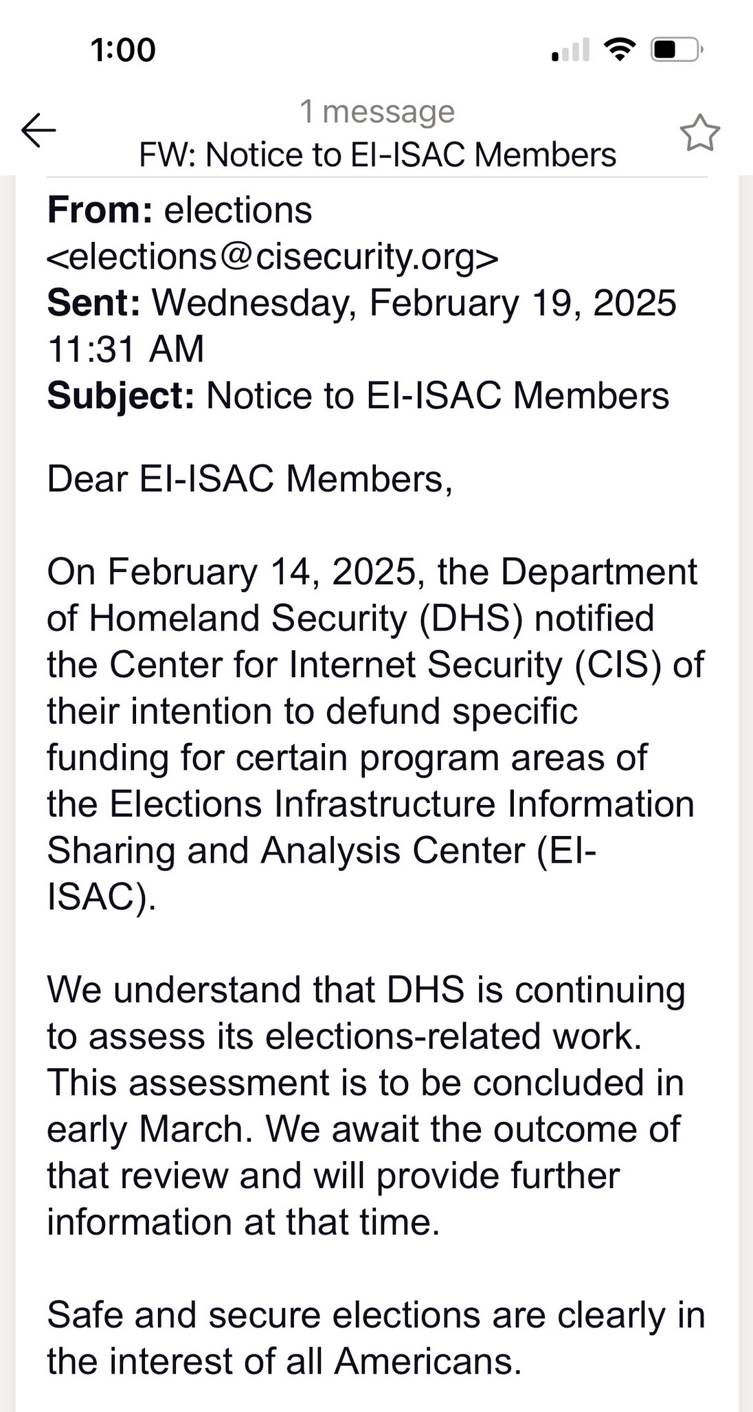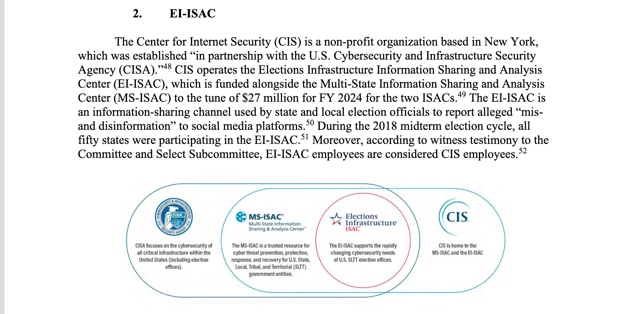 According to the committee report: CIS operates the Elections Infrastructure Information Sharing and Analysis Center (EI-ISAC), which is funded alongside the Multi-State Information Sharing and Analysis Center (MS-ISAC) to the tune of $27 million for FY 2024 for the two ISACs. The EI-ISAC is an information-sharing channel used by state and local election officials to report alleged “mis- and disinformation” to social media platforms. During the 2018 midterm election cycle, all fifty states were participating in the EI-ISAC. Moreover, according to witness testimony to the Committee and Select Subcommittee, EI-ISAC employees are considered CIS employees.