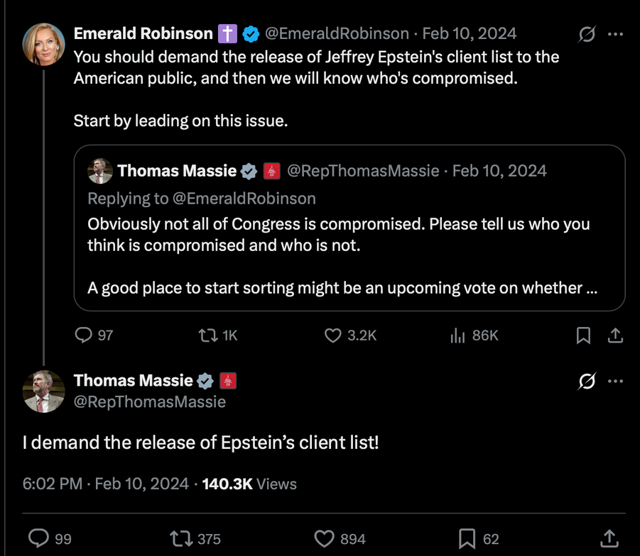 How? Well, I told Thomas Massie back in February 2024 on Twitter/X that the Epstein files were the key to understanding how compromised our Congress had become through blackmail and corruption.