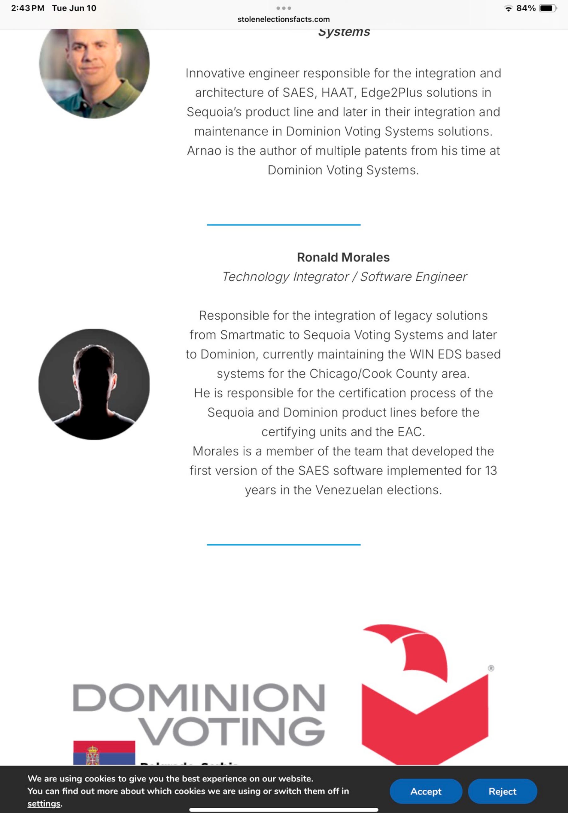 According to Peter Bernegger’s source, a man named Bob DeMaria: “Morales began his career in elections when he joined Smartmatic in 2004 where he [managed] the EMS Quality Assurance process for elections in Venezuela. After the acquisition of Sequoia by Smartmatic, he was responsible for the integration of Smartmatic’s newly-developed equipment with Sequoia’s EMS and for the EAC certification of the integrated solution.”