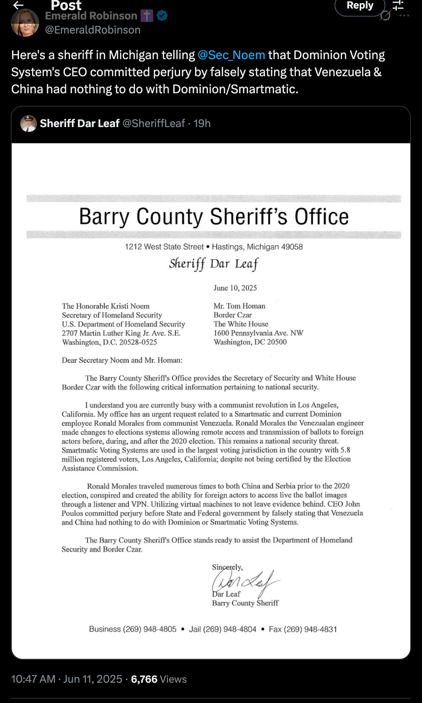 The Sheriff of Barry County, Michigan — Dar Leaf — has released a bombshell letter that he’s sent to DHS Secretary Kristi Noem as well as Border Czar Tom Homan about America’s corrupt voting machines.